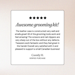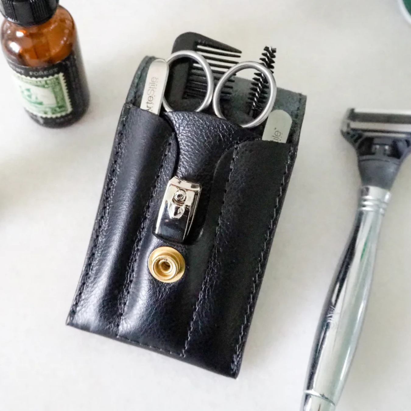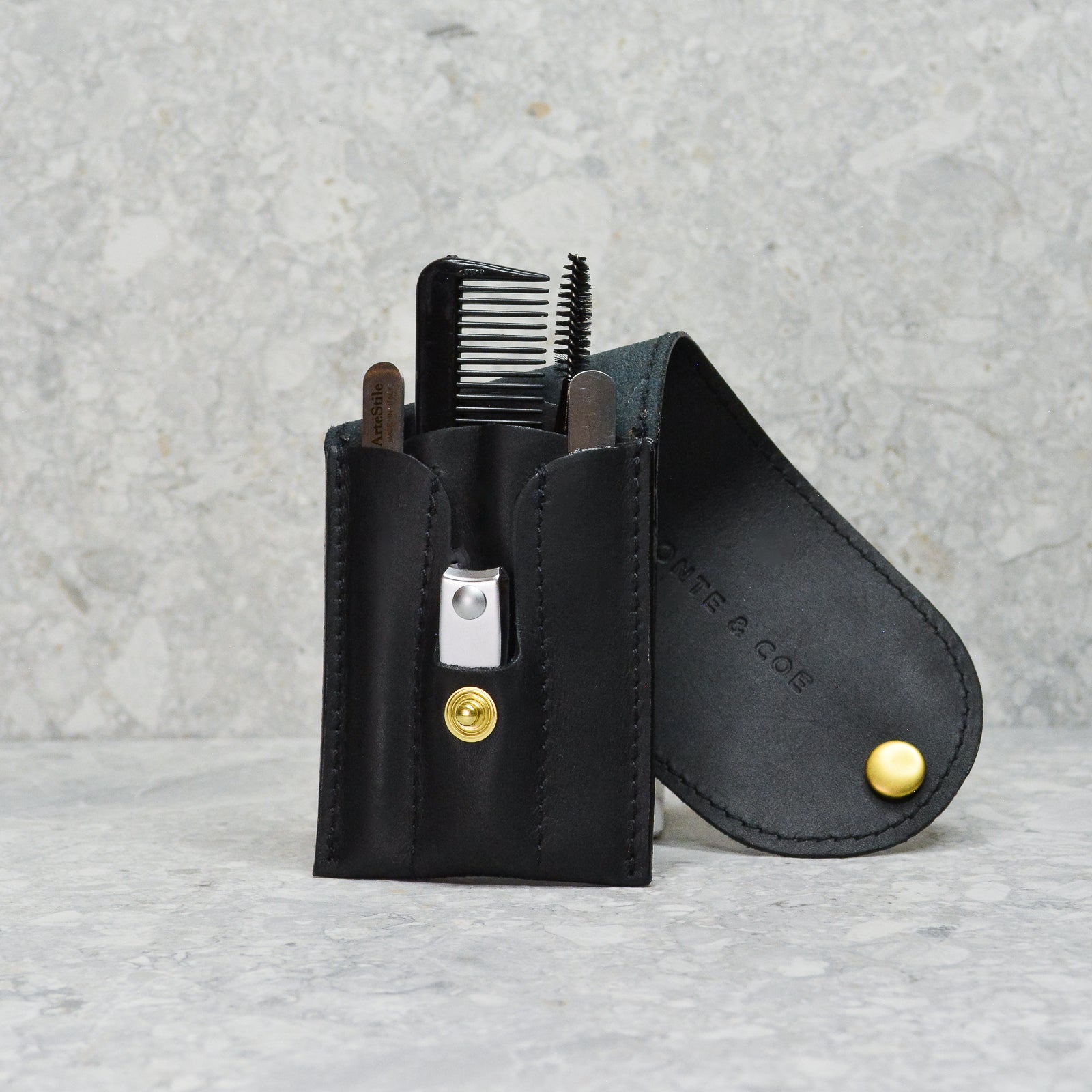 The Luxury Grooming Kit brings together all the essentials for flawless grooming in one sleek set. All tools come beautifully housed in a vegetable-tanned leather case by our friends at Monte & Co, featuring a soft suede interior, Italian brass snap button, and hand-painted edging.